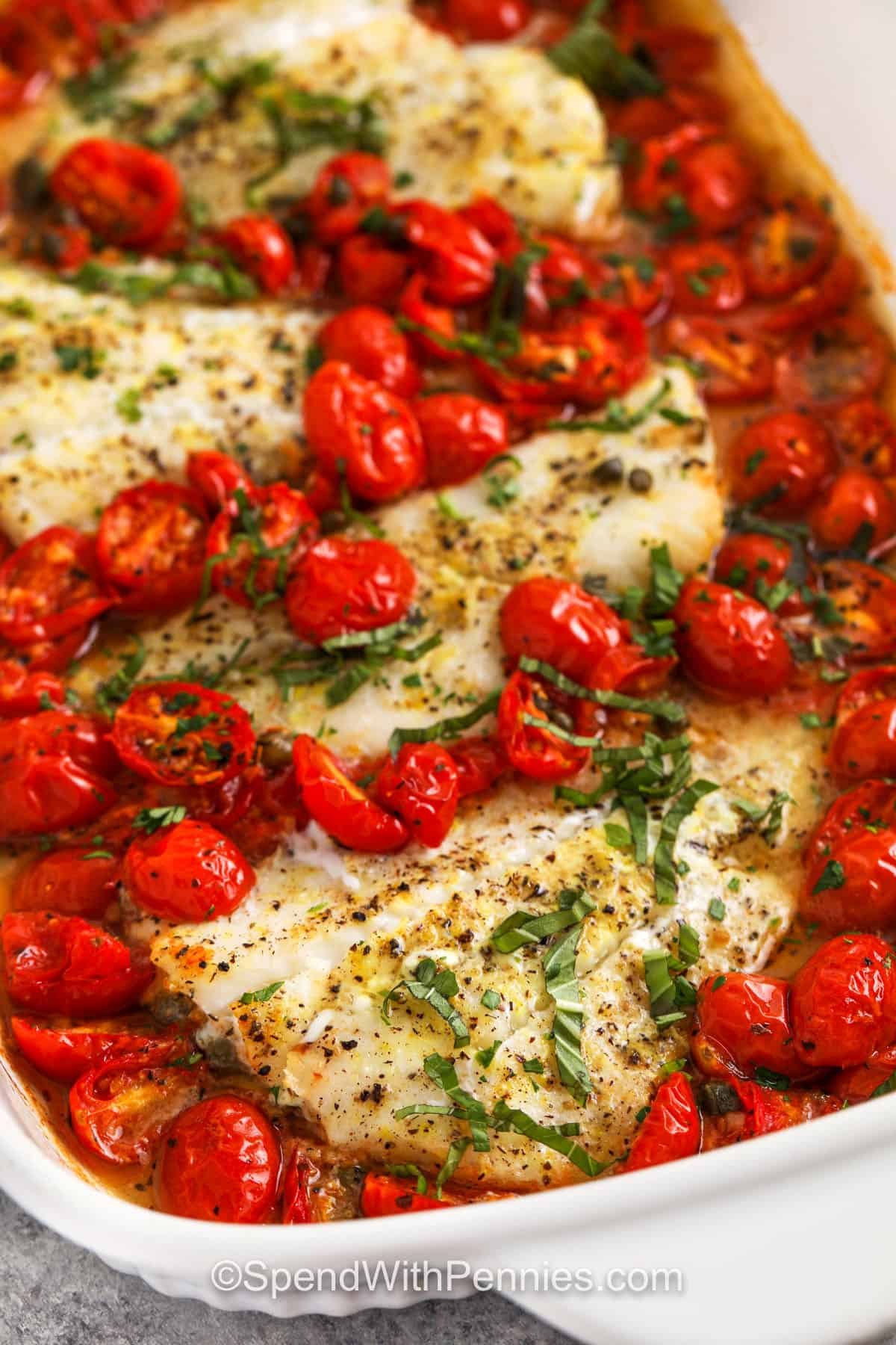 Mild, tender cod filets are baked in a buttery lemon pepper sauce with cherry tomatoes and capers, and topped with fresh herbs. It’s a simple, vibrant dish full of flavor.