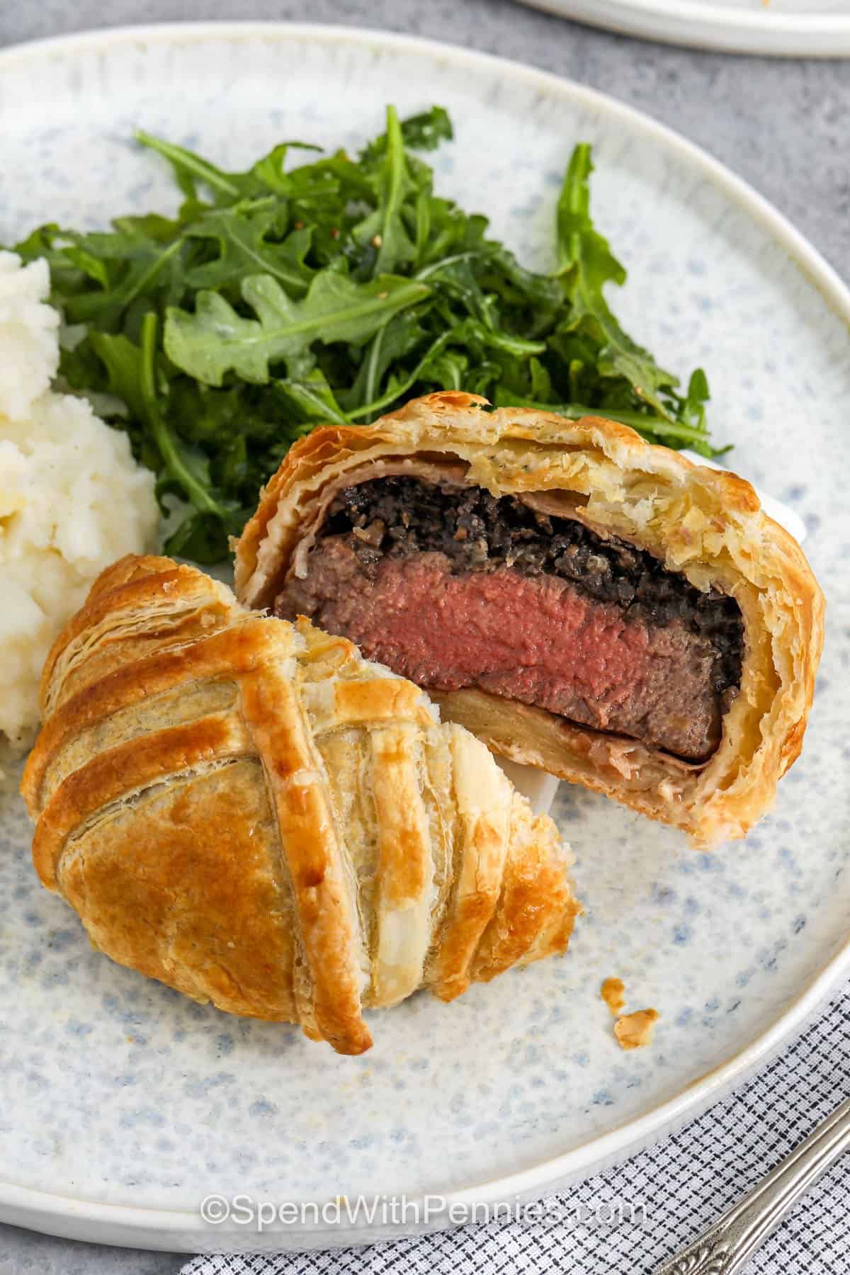 The beef will be undercooked when removed from the oven, but the heat inside the puff pastry will continue to cook while resting.