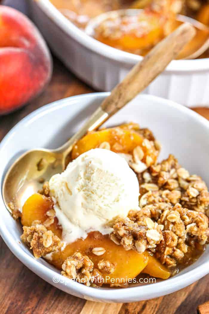 Warm, bubbly sliced peaches with a hint of cinnamon are baked under a buttery oat crumble that’s crisp and golden, for a dessert that’s easier than pie but just as satisfying!