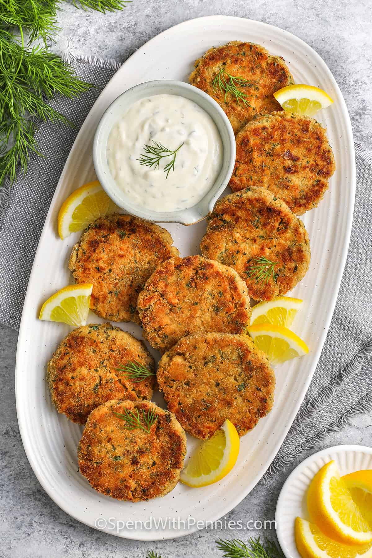 Use fresh salmon filets or canned flaked salmon and a sprinkle of seasonings. Coat them in breadcrumbs and pan fry them to crispy, golden perfection!
