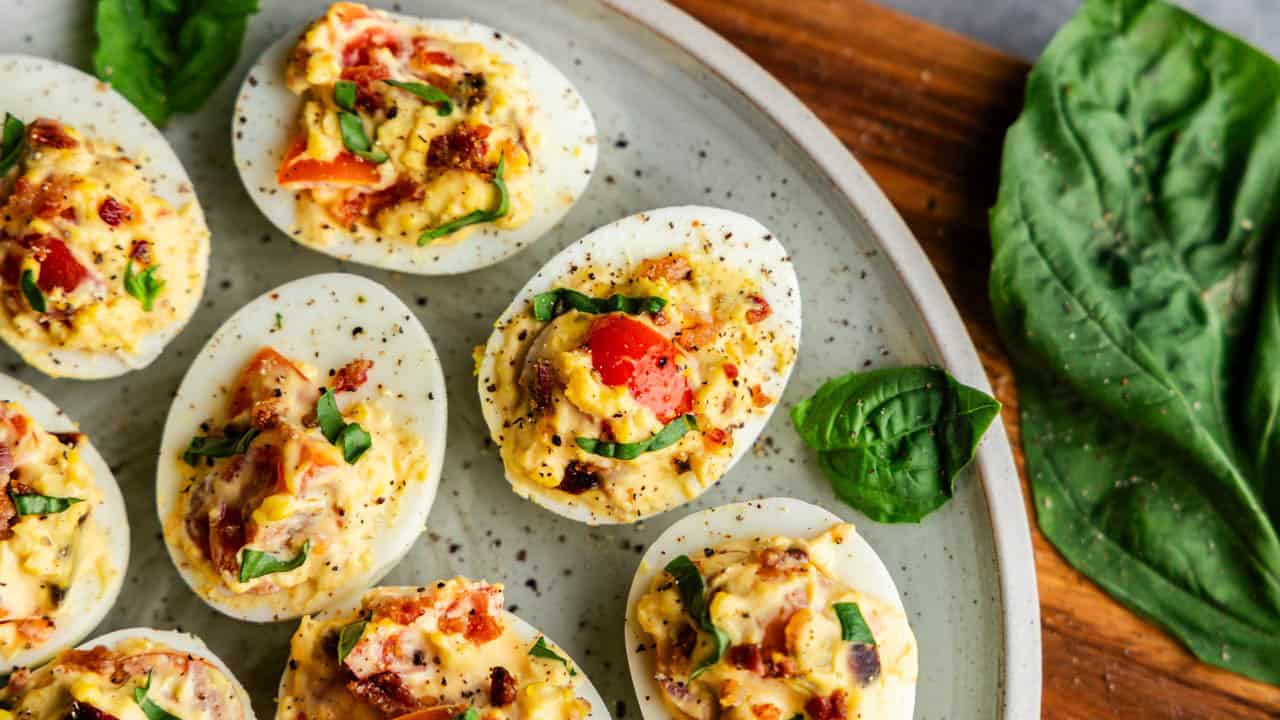 Want a BLT without the commitment of a whole sandwich? This easy deviled egg recipe combines fresh basil and tomato with our salty and sweet candied bacon giving you the perfect blend of flavors and texture in one bite. If you like more of a savory flavor profile, you can use regular bacon or, if you’re pressed for time, pick up some bacon crumbles from the grocery store. Either way, you want to make sure you’re getting that crispy crunch to give with the creaminess of the mustard and mayo filling. We recommend using fresh basil to mix in the filling and to garnish, but if you’re not a fan, you can always use parsely instead.
